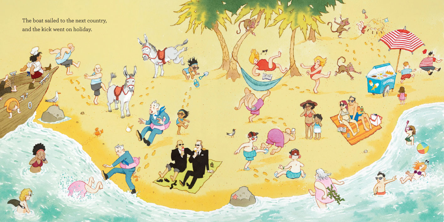 Unable to retaliate, but similarly feeling rather cross, Vlad kicks Tad's mum who kicks the postman, who kicks a policewoman who kicks a politician . . . Until the kick travels around the whole world! Only to land back up at Tad's birthday party a year on . . .