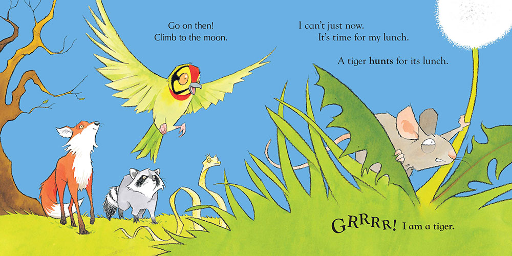 The bold little mouse declares "I am a tiger." and manages to convince a raccoon, a fox, a snake and a bird not only that this is true, but that they are not what they think they are. When a real tiger turns up, can the persuasive and fearless little rodent manage to persuade the tiger that he is a mouse?