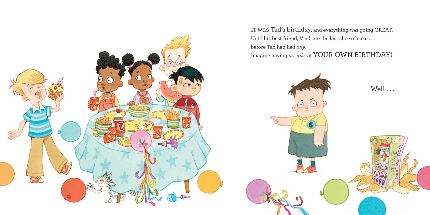 In a moment of fury, induced by a piece of stolen birthday cake, Tad kicks his best friend Vlad and runs away to hide.