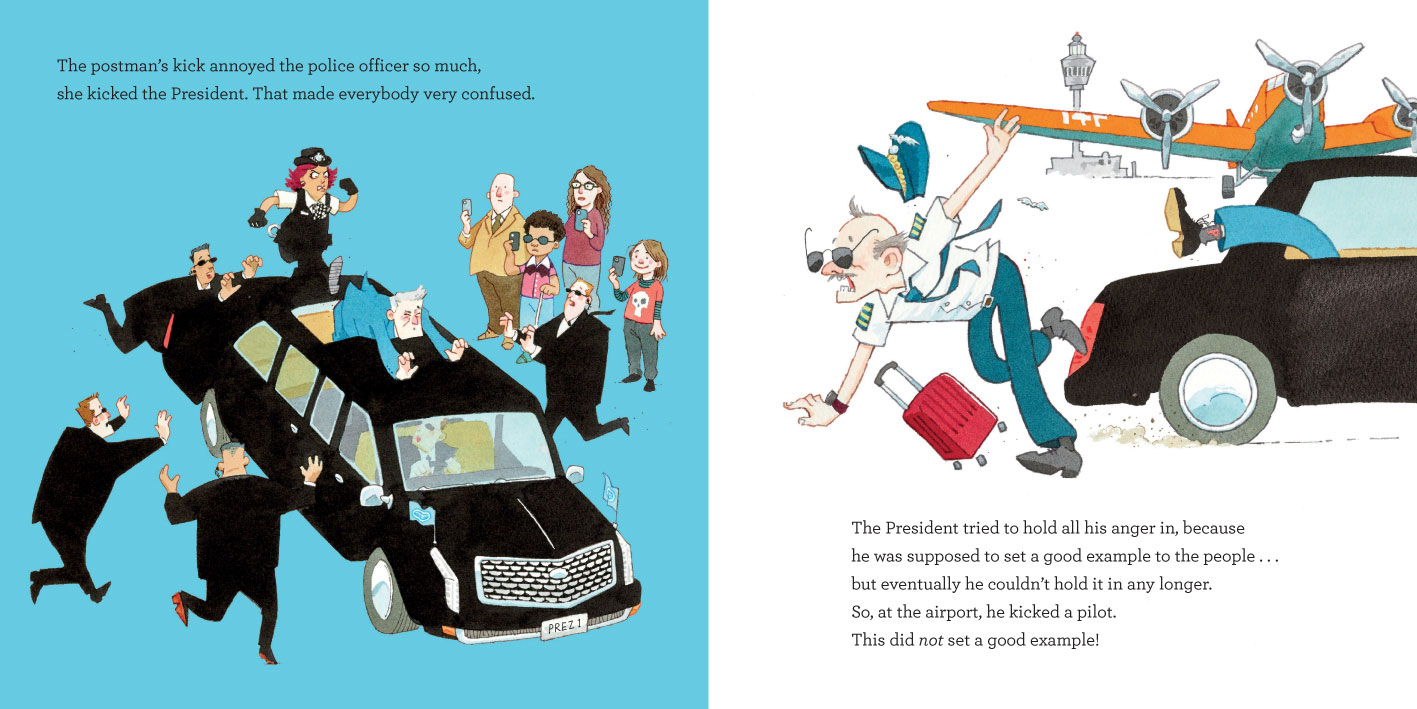 Unable to retaliate, but similarly feeling rather cross, Vlad kicks Tad's mum who kicks the postman, who kicks a policewoman who kicks a politician . . . Until the kick travels around the whole world! Only to land back up at Tad's birthday party a year on . . .